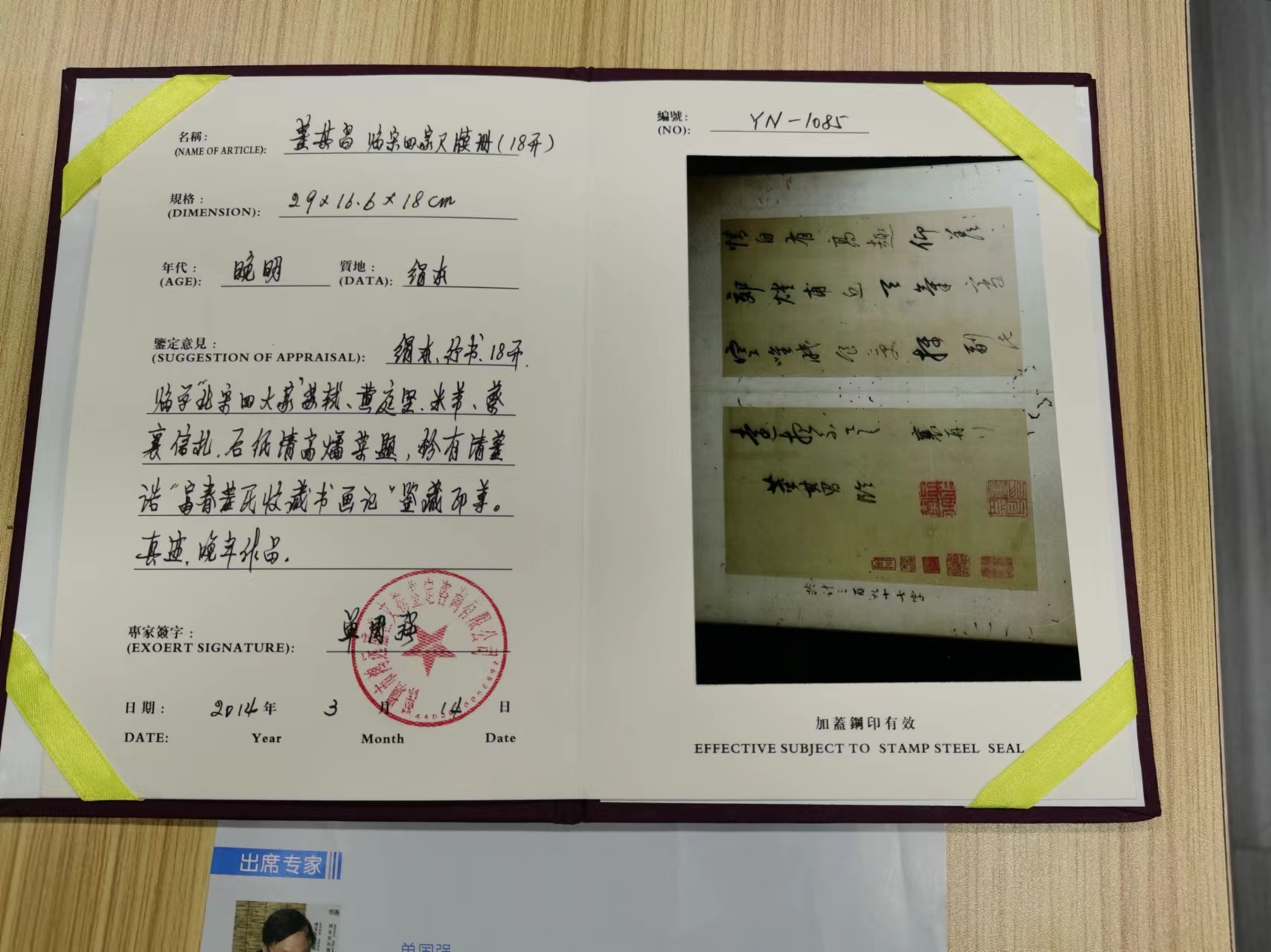 打开鉴定证书,映入眼帘的鉴定人是闻名中外的单国強,他曾任故宫博物院陈列部主任、宫廷部主任、研究员。中国美术家协会会员、中国博物馆学会会员、央视《寻宝》栏目专家评委、国内著名书画鉴定专家。