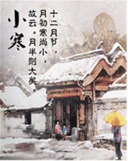 1、腊八粥(北京及大部分地区) 2、麻辣火锅、涮烤羊肉(北京及大部分地区) 3、吃菜饭(南京) 4、糯米饭(广东) 5、黄芽菜(天津) 6、羊肉、牛肉、狗肉 7、鸡肉、鸡汤、鸡蛋 8、蔬菜、水果、干果 养生按照传统中医理论,滋补分为四类,即补气、补血、补阴、补阳。要针对不同体质科学进补。 中医认为,人体内的血液,得温则易于流动,得寒就容易停滞。所谓“血遇寒则凝”说的就是这个道理。所以保暖工作一定要做好,尤其是老年人。 民谚曰:“冬天动一动,少闹一场病;冬到懒一懒,多喝药一碗。”这说明了冬季锻炼的重要性。 小寒时节,生活须养生保健,饮食应增苦减甘,起居要呵护保暖,运动宜日出锻炼,处事更心态乐观。哈哈!合辙押韵! 四、二十四节气的文化奇观 详见概论和纵览 文化贡献 详见概论和纵览 文化遗产 详见概论和纵览 文化经典 详见概论和纵览 小寒配诗词 唐•元稹诗选《咏廿四气诗》小寒十二月节 小寒连大吕,欢鹊垒新巢。 拾食寻河曲,衔紫绕树梢。 霜鹰近北首,雊雉隐丛茅。 莫怪严凝切,春冬正月交。 宋•陆游 小园独酌 横林摇落微弄丹,深院萧条作小寒。 秋气已高殊可喜,老怀多感自无欢。 鹿初离母斑犹浅,橘乍经霜味尚酸。 小酌一卮幽兴足,岂须落佩与颓冠? 文化杂谈 详见概论和纵览 下面更精彩 节气的文趣 俗话说:“热在三伏,冷在三九”“夏练三伏,冬练三九”,这是天气冷热的两个极端。 冬至过后数九天,小寒节气十五天,七八处于三九天。 小寒大寒,恰逢冬月、腊月。腊七腊八,冻裂脚丫。腊七腊八,冻死寒鸦。腊八腊九冻死小狗。 小寒大寒,冻成一团。小寒胜大寒,常见不稀罕。 小寒大寒是一年最寒冷的时节,却是人们最忙碌、最热闹、最温暖、最幸福的时候。“小寒大寒,准备过年”“小寒回家,大寒过年”“小寒忙买办,大寒要过年”“小寒大寒又一年”。 小寒时节,天寒地冻,万花凋谢,只有梅花凌霜而开。其品格一直被文人墨客赞不绝口,名篇佳作也是经久吟诵。