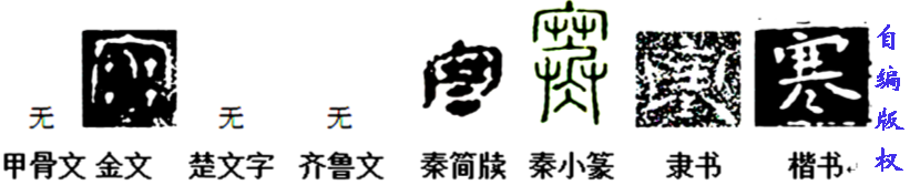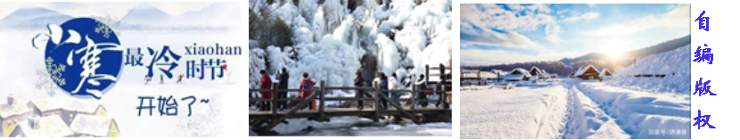 会意字,金文外面是宀(mián),即房屋,中间是“人”,人的左右两边是四个“草”,表示很多,下面两横表示“冰”。寒冷是一种感觉,看不见。于是古人就采用上述四个形体来创造这个字,人踡曲在室内,以草避寒,表示天气很冷。 多义字,本义:冷,很冷,寒冬,寒冽。 还有:1畏惧:胆寒。2害怕:心寒。3穷困:寒酸、寒士。4难看:寒碜。5谦辞:寒门、寒舍…… 许慎《说文》:寒,冻也。《列子·汤问》:凉是冷之始,寒是冷之极。 这里主要是:寒冷,与“暑”相对。 小寒二十四节气的第二十三个,冬季的第五个。每年阳(公)历的1月6日前后交节,太阳到达黄经285°即是。四大、四小之一。去年是1月5日,今年是1月6日。 《月令七十二候集解》:十二月节,月初寒尚小,故云。月半则大矣。 解读:小满、大满、小暑、大暑、小雪、大雪、小寒、大寒,都是表示气象、气候、气温大小变化的节气。 十二月节气,天气已经很冷,我国大部分地区小寒和大寒期间都是最冷的时期。大雪漫天飞舞,一个银装素裹、冰雕玉琢的世界,一派天寒地冻的景象。 “小寒”一过,就进入“冰上走”的三九天了。 古语有曰:小寒十五天,七八处于三九天。小寒胜大寒,常见不稀罕。小寒大寒,冻成一团。